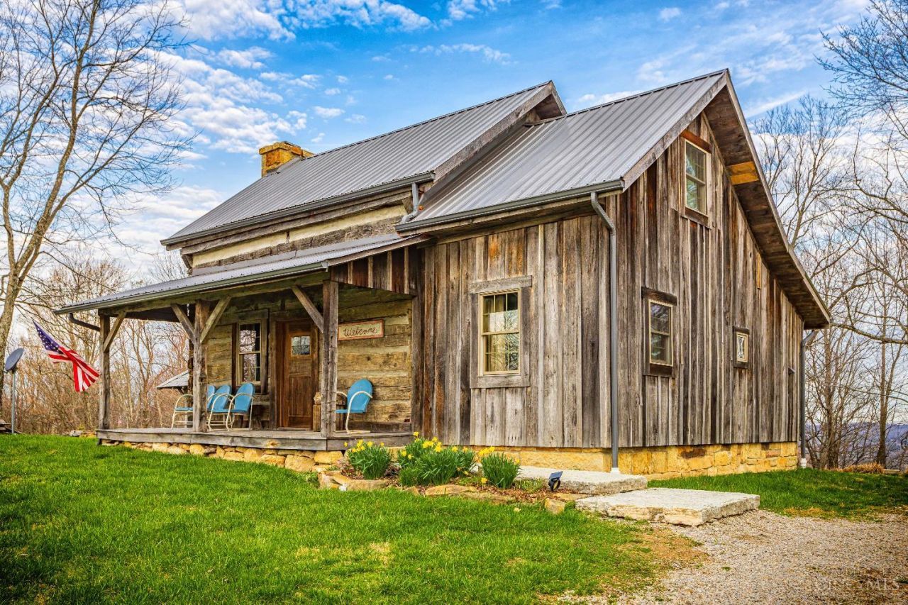 Rustic cabin on approx. 10 acres with scenic views of the rolling foothills of Adams County. This unique property was reconstructed using original stones and hand-hewn logs from historic structures over 100 years old, blending Appalachian character with modern comfort. Home features 2 BR and 2 full baths. The upstairs BR includes wood flooring, walk-in closet, and private bath with tiled shower and floor. Kitchen offers hickory cabinetry, concrete countertops, and appliances. The living room features wood flooring and a striking stone chimney fireplace. Enjoy the peaceful setting from the covered front and back porches overlooking the countryside. Property includes abundant wildlife, fire pit, and timber-framed gazebo with picnic area. Ideal for a private retreat, weekend getaway, Airbnb/short-term rental, hunting cabin, or recreational property. Conveniently located within 30 minutes of Serpent Mound, Edge of Appalachia preserves, Ohio Brush Creek, and numerous hiking trails!
