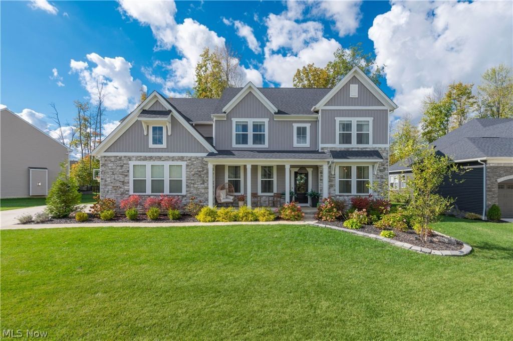 Stunning Ashlawn home built by Drees Custom Homes, located in one of Columbia Station's most desirable neighborhoods. This custom, ultra optioned build is designed for modern family living, offering 4 bedrooms, 4.5 bathrooms, a private office, and a finished basement with bonus space. An oversized side-load garage and expansive covered front porch create a welcoming first impression. Inside, the foyer is flanked by a formal dining room and private office, preserving classic colonial charm. The main living area features an open-concept layout connecting the great room, chef's kitchen, casual dining area, and sunroom. An upgraded kitchen boasts Level 4 quartz countertops, stacked upper cabinets with crown molding, gas cooktop, double wall ovens, premium stainless-steel appliances, and bronze fixtures. The vaulted great room highlights a floor-to-ceiling stone gas fireplace and oversized sliding glass doors that seamlessly extend to the covered outdoor living space, complete with a second stone gas fireplace. A stamped concrete patio with gas firepit enhances the outdoor entertaining experience. Upstairs, the luxurious primary suite features tray ceilings, dual vanities, a tile super shower, freestanding tub, ceramic tile floors and a custom walk-in closet with built-ins. Three sizeable additional bedrooms include one with a private en-suite bath and walk-in closet. A full guest bath and convenient second-floor laundry including washer and dryer complete the level. The finished basement offers exceptional entertaining space with a rec room, fireplace, full wet bar, full bath, and bonus guest room. Premium upgrades throughout include luxury vinyl flooring, quartz surfaces, custom lighting, and upgraded doors and trim. Outside, professionally landscaped grounds surround the home, with additional features including a shed, swing set, and hot tub.