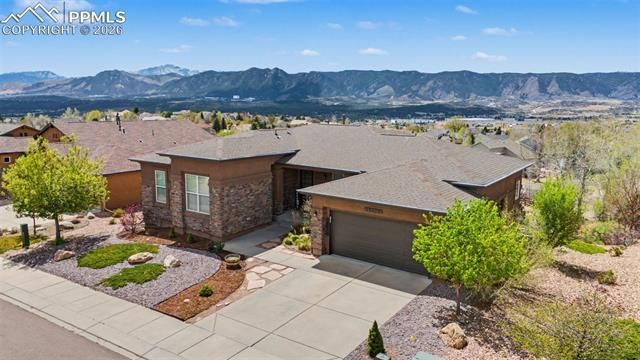 Sweeping views of the entire Front Range, iconic Pikes Peak, and the United States Air Force Academy—a rare blend of location, scenery, and space. Just minutes from I-25 and everyday amenities, this home features an open, light-filled floor plan—perfect for entertaining— a great kitchen with a walk-in pantry. The main-level primary suite includes a relaxing soaking tub. Situated with the rear of the house facing west, you can enjoy the stunning views inside from the primary suite and living room, or take in the beautiful sunsets outside on the spacious deck. The finished walkout basement offers flexible living with large bedrooms, a family room, wet bar, wine rack, gas fireplace, and covered patio—ideal for guests or multi-generational living. 3-car garage plus recent updates, including newer appliances, garage door, and water heater.