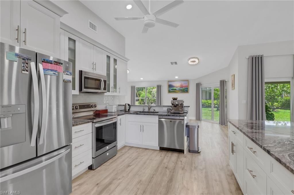 NOT A FLOOD ZONE! Beautifully updated and with southern rear exposure in a convenient part of SE Cape Coral. Easy access to Veteran's and the Midpoint Bridge, This great room style home is move in ready and has City Water and Sewer in and Paid. Large open kitchen with granite counter tops, lots white shaker style cabinets for storage, Stainless Steel appliance package and is a great place to entertain family and friends. Bedrooms has updated barn doors, owner's bath has custom tile work and frameless glass shower doors, soaking tub, matching granite counters and dual vanities. Large under truss screeded in lanai for enjoying the weather. Sliders are updated dual pane. Roof is 2021. Outside has mature Floritam lawn, automatic sprinklers, and mature tropical landscaping.