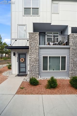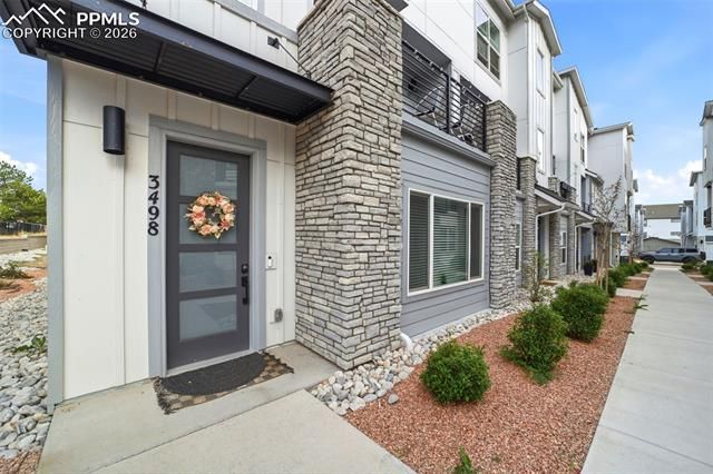 Welcome to this stunning 4-bedroom, 4-bathroom townhouse in the sought-after Centennial Townes community, built in 2023. This modern three-level home features a bright and open layout with clean lines and contemporary finishes throughout. Enter on the lower level to find a private guest suite designed for comfort and privacy. It includes a spacious bedroom, a full ensuite bathroom, a cozy sitting area, and a convenient kitchenette—perfect for guests or multigenerational living. The main floor showcases an open-concept living, dining, and kitchen area that flows seamlessly and is filled with natural light from large windows. The living room opens to a large balcony/patio, offering a perfect indoor-outdoor living experience. The kitchen provides plenty of cabinet space, a large pantry, a central island with extra seating, and sleek stainless steel appliances. Upstairs, an open area with a built-in desk creates an ideal space for a home office or study nook. The generous primary suite is bright and inviting, featuring a spacious ensuite bathroom with dual sinks and a large walk-in closet. Two additional guest bedrooms share a full bathroom, making this home perfect for families and guests alike. Additional highlights include an oversized two-car garage, pre-wired for an EV charger and spectacular mountain views. Enjoy easy access to the stunning Garden of the Gods with its trails and breathtaking scenery, as well as nearby restaurants, shopping, and top-rated schools. Experience stylish, modern living in a location that truly has it all. This townhouse is ready to welcome you home!